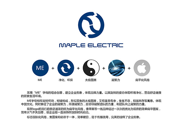MAPLEELECTAIC環保科(kē)技(jì)公司LOGO設計(jì)釋義介紹,采用(yòng)ME字母的(de)組合創意,建立企業(yè)形象,體(tǐ)現(xiàn)品牌力量。α以其旋轉的(de)姿态體(tǐ)現(xiàn)環境淨化(huà),營造舒适健康的(de)居家(jiā)生(shēng)活環境。